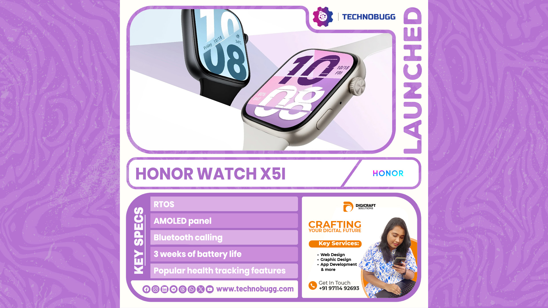 The new Honor Watch X5i comes with RTOS along with up to three weeks of battery life. The device features an AMOLED panel with 450 x 390 pixels resolution and a 60Hz refresh rate. The device also supports over 180 watch faces as well.